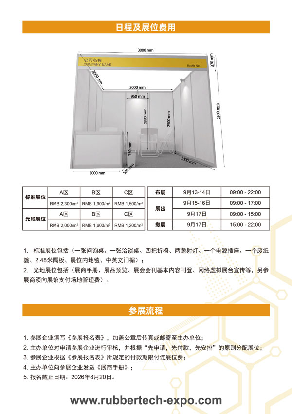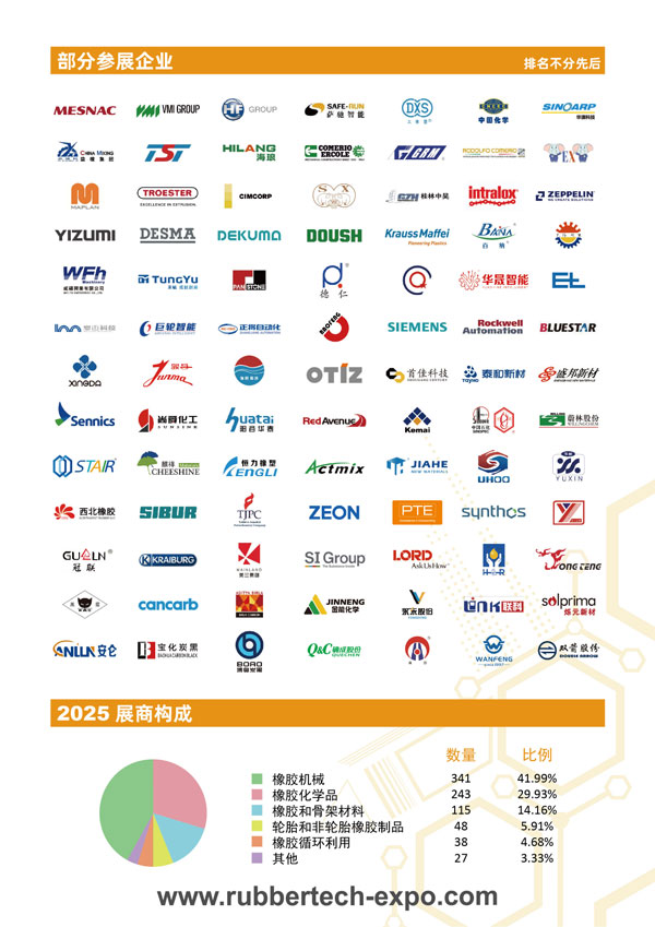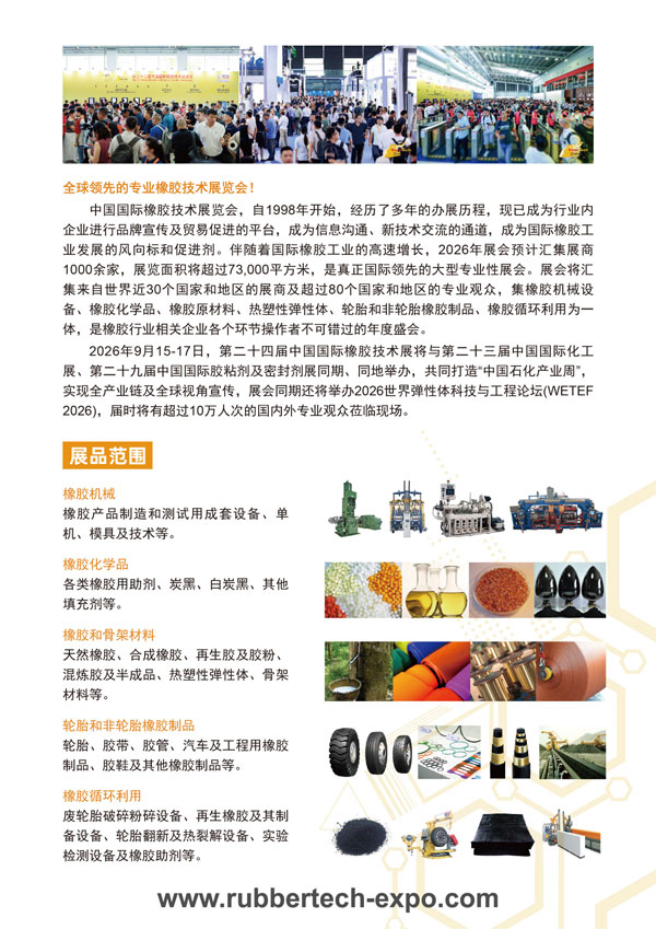 展会集橡胶机械设备、橡胶化学品、橡胶原材料、热塑性弹性体、轮胎和非轮胎橡胶制品、橡胶循环利用为一体,是橡胶行业相关企业各个环节操作者不可错过的年度盛会。这里既是展示最新技术与产品的核心舞台,也是链接全球优质买家、深化行业合作的高效平台。 随文附上展会邀请函,内含展会简介、展品范围、展会亮点、展位费用及参展流程等。