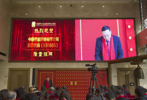 2016年11月9日上午,中联橡胶股份有限公司(以下简称“中联橡胶”,股票代码:838665)在全国中小企业股份转让中心,北京金融大街金阳大厦隆重举行了新三板挂牌敲钟仪式。 中联橡胶高管(董监高)魏云、马军华、吴庆罗、周衡龙,徐世强、于海元、梁丽萍、刘挺、许田惠子和招商证券负责督导工作的穆雅斌共10位同志代表中联橡胶出席了挂牌敲钟仪式。 在挂牌敲钟仪式上,董事长魏云先生代表公司董事会致辞并敲响了公司股票挂牌新三板的钟声。他在致辞中向为中联橡胶新三板挂牌提供优质服务,付出辛勤劳动的招商证券、君泽君律师事务所、亚太会计师事务所等机构的各位朋友表示了感谢!也向这些年来给予中联橡胶厚爱和支持的广大客户,以及为公司发展做出努力的公司团队表示了谢意! 魏云董事长还表示,公司将以此新三板挂牌为契机,倍加努力,不断应对市场的变化,更加贴近客户的需求,精心组织,认真实施、用3至5年时间,做大做全做强橡胶轮胎展会,争取发展成为世界知名的会展商和专业的贸易服务商。以创造最大的利润回馈股东,回报社会。