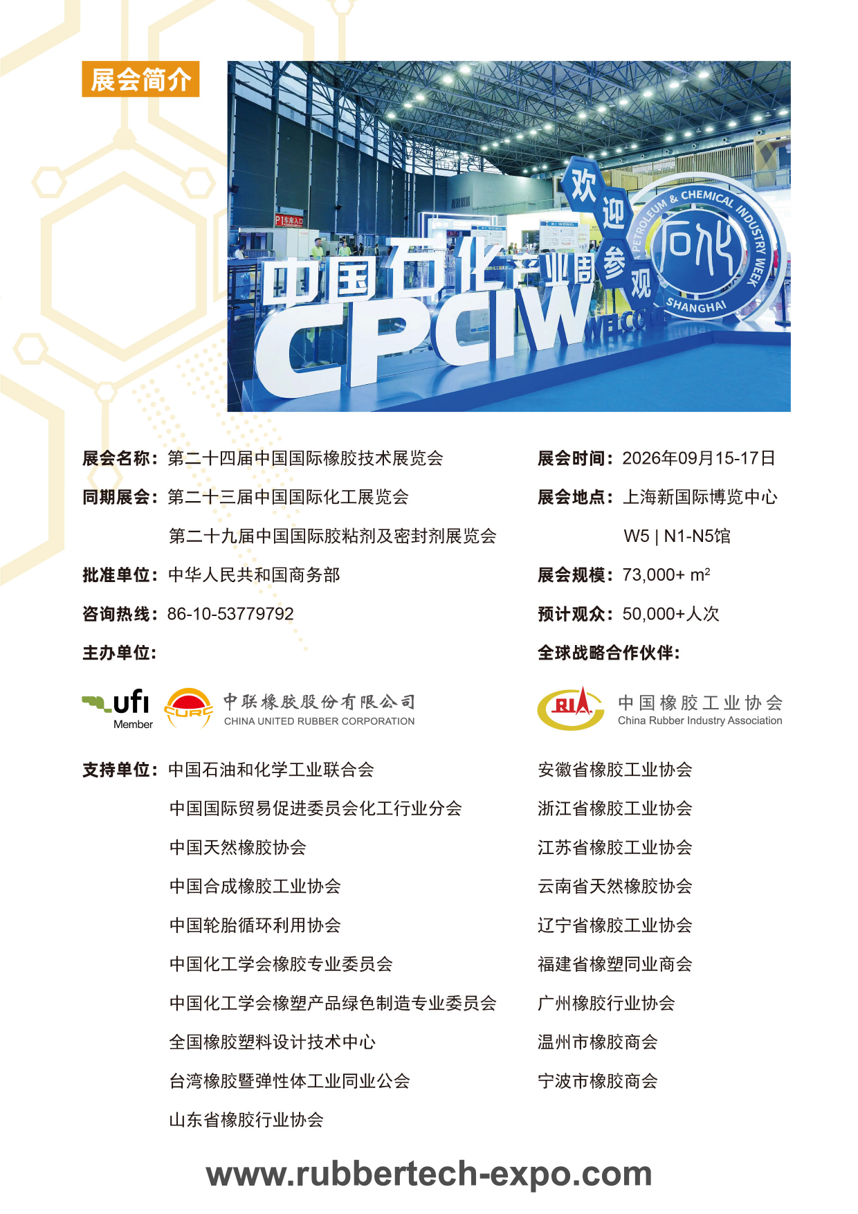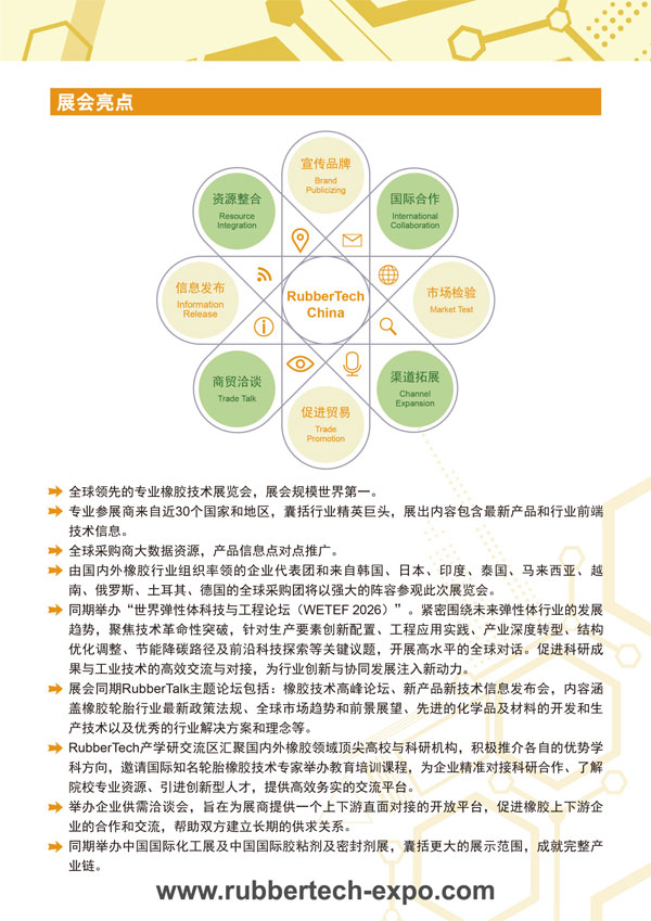 展会集橡胶机械设备、橡胶化学品、橡胶原材料、热塑性弹性体、轮胎和非轮胎橡胶制品、橡胶循环利用为一体,是橡胶行业相关企业各个环节操作者不可错过的年度盛会。这里既是展示最新技术与产品的核心舞台,也是链接全球优质买家、深化行业合作的高效平台。 随文附上展会邀请函,内含展会简介、展品范围、展会亮点、展位费用及参展流程等。